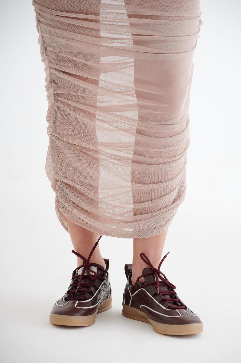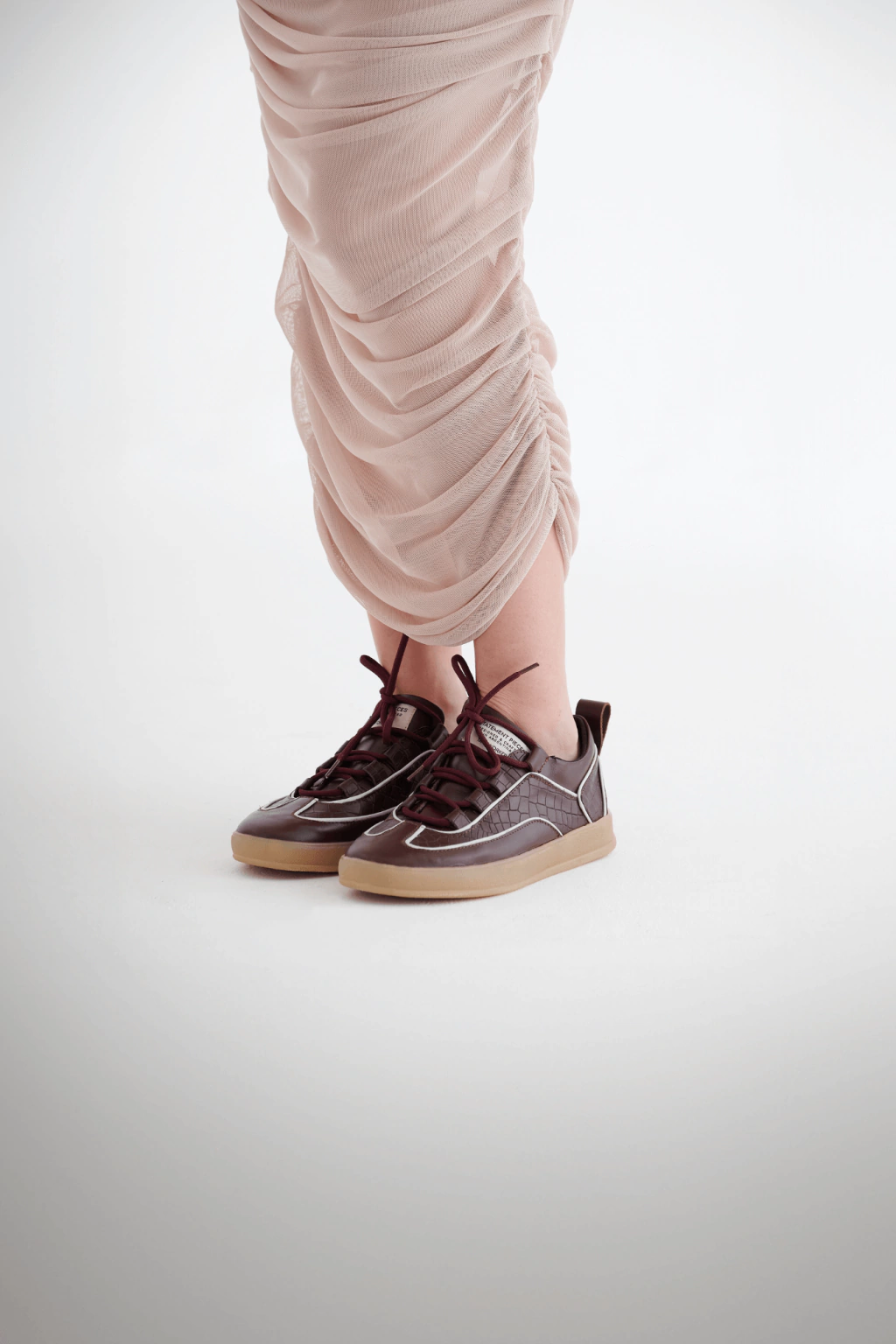 Zapatillas confeccionadas en cuero genuino napa bordo, ribeteada en cuero napa off white. Llevan cordones de algodón a tono, y etiqueta bordada en la lengueta. En la talonera tienen una tira para calce con aplique TY níquelado. La base es color crepe de TR mega liviana. Son EL ítem cómodo y canchero con el toque TRYK que no te puede faltar esta temporada!
