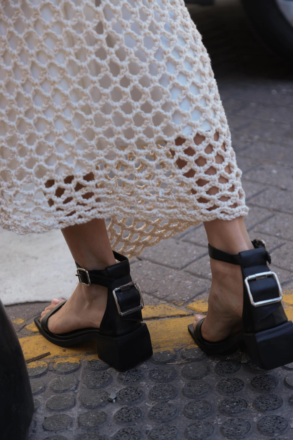 Sandalias de punta cuadrada con base geometrica confeccionada en cuero genuino negro alto brillo. Su capellada se compone de una tira delantera, y una trasera que se sujeta al tobillo mediante pulsera regulable. Tiene detalle de hebilla en la parte trasera de la talonera. Lleva taco cuadrado de 4,5 cm, sumando unos centímetros sin resignar nada de comodidad.